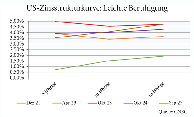 Die Arbeitsmarktdaten sind seit mehreren Monaten schwach in den USA, daher setzen die Anleger auf eine baldige Zinssenkung der FED. Das hat die Renditen von Staatsanleihen am kurzen Ende deutlich sinken lassen. Zugleich sind sie am langen Ende aber kaum gefallen. Das dürfte ein Misstrauensvotum zur langfristigen Staatsfinanzierung sein, das in ähnlicher Form auch in Europa zu beobachten ist.