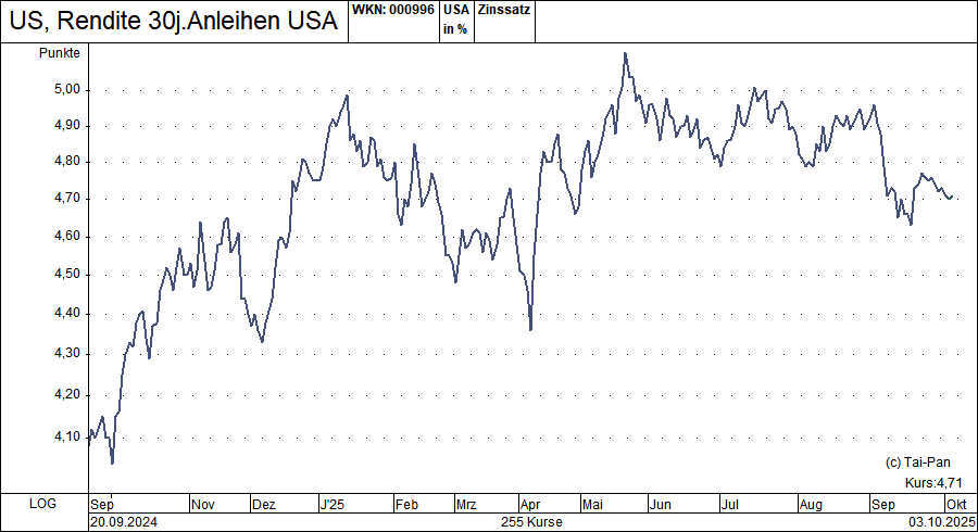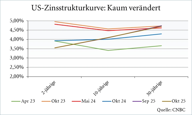 Das verdeutlich schon, dass unter Trump die Uhren etwas anders ticken, denn der aktuelle Präsident setzt extrem stark auf Polarisierung, was die Fronten verhärtet. Auch jetzt, im Shutdown, sind von ihm vor allem Drohungen gegen die Demokraten zu hören. Wie und wann ein Kompromiss gefunden werden kann, ist vor diesem Hintergrund schwer zu sagen. Die Märkte reagieren aber recht routiniert darauf und ignorieren den Konflikt bislang. Selbst bei den Zinsen von US-Staatsanleihen, die am ehesten von der künstlichen Krise berührt werden sollten, hat sich nichts getan. Die Zinsstrukturkurve ist aktuell sogar nahezu deckungsgleich mit dem Verlauf von Anfang September.