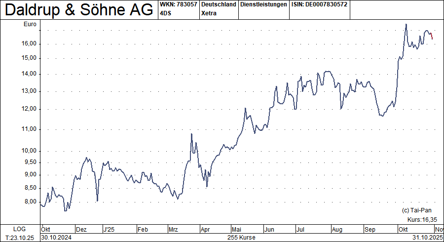 Die Aktie von Daldrup & Söhne, Mitglied im Value-Stars-Deutschland-Index, hat in den letzten Monaten stark performt. Der Aufschwung ist durch die aussichtsreichen Perspektiven des Unternehmens, die sich zuletzt insbesondere im Auftragseingang niedergeschlagen haben, gut abgesichert.