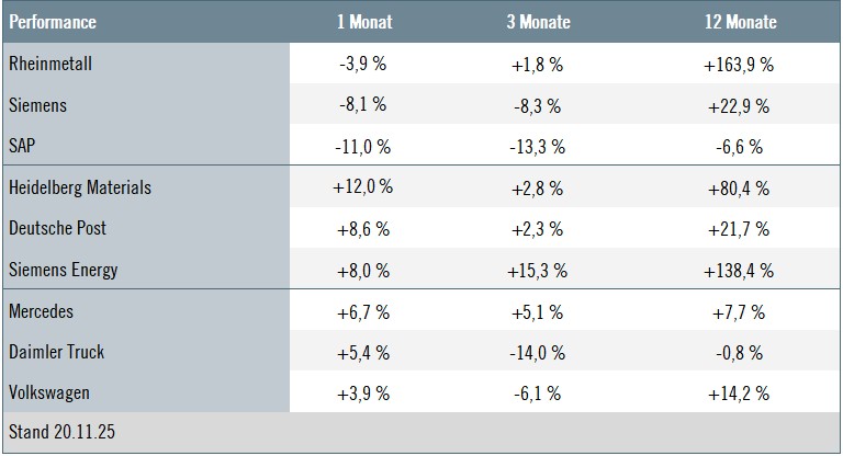 Die Anleger suchen daher nach Alternativen und werden durchaus bei Werten fündig, die auch zuvor schon gut gelaufen sind. So wird die Performance-Liste des letzten Monats von Heidelberg Materials, Deutsche Post und Siemens Energy angeführt – alles Titel, die auch bei der Zwölfmonatsrendite glänzen. Aber auch bei den vorherigen Underperformern tut sich etwas. Insbesondere die gescholtenen Automotive-Werte konnten sich allesamt eher im oberen Bereich des Tableaus platzieren. Und das, obwohl der DAX insgesamt schwach war. Abschläge bei den vorherigen Favoriten und eine Erholung bei schwachen Werten – das ist zumindest im Ansatz eine gesunde Sektorrotation.