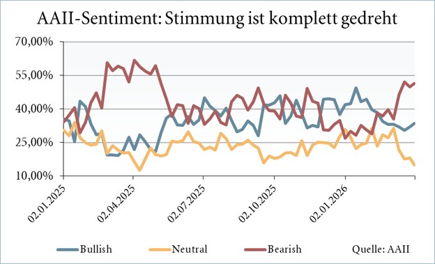 Die Anleger waren lange Zeit stimmungsmäßig unentschieden, dann sind sie wegen der Chance auf eine Konjunkturerholung im Q1/2026 mehrheitlich auf die Bullenseite gewechselt – und wurden vom Irankrieg kalt erwischt. Die Bärenquote in der AAII-Umfrage hat in den letzten Wochen einen Sprung nach oben gemacht, zwischenzeitlich auf das höchste Niveau seit den Zollturbulenzen im letzten Jahr. Die Bullenquote ist aber nicht ganz so stark erodiert wie damals, da ein Teil des Zuwachses aus dem stark geschrumpften neutralen Lager kam.