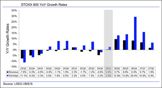 Steht realwirtschaftlich die Wende nach oben in Europa an? Die Analysten glauben zumindest daran. Die Konsensschätzungen für den breit gestreuten STOXX 600 sehen auch etliche Wochen nach dem Ausbruch des Irankriegs für Q1 noch ein kleines Umsatzplus von 0,4 % für die Unternehmen vor – das wäre das erste nach drei Quartalen mit Rückgängen.